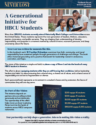 HBCU Initiative Download Here PRESS RELEASES Click Icons Below to View In an Age of Upheaval, New Book Explores Why Faith Communities Are “Never Lost” Dr. W. Franklyn Richardson Calls for Inclusive Theological Leadership in Never Lost New National Initiative Seeks to Place Never Lost in the Hands of Every HBCU Student Ways to Promote Core Asks Easy ways you can amplify the message and reach of Never Lost by ordering, recommending, and sharing. Download Here